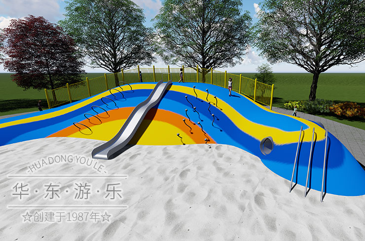 无尽沙池边缘有一座舞彩缤纷的山丘,山丘的山坡上有攀岩柱、攀岩环、攀岩扶手,以及能够从山顶直接滑下的滑梯;山腰中部还有一个山洞,借此机会还可以与小朋友来一场躲猫猫。