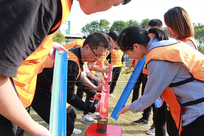 击鼓颠球又叫动感颠球、鼓动心声、鼓动人心,这是一个要求团队高度协作的项目,需要大家在短时间内制定出达到目标的方案,并在执行过程中协调一致。实际操作时,难免会遭遇排球落地、落绳子上,学员身上等失败的情况。这就要求队员们在认真负责的同时能够沉下心来,承受得住失败的挫折,越挫越勇,持之以恒,最终成功地完成任务。