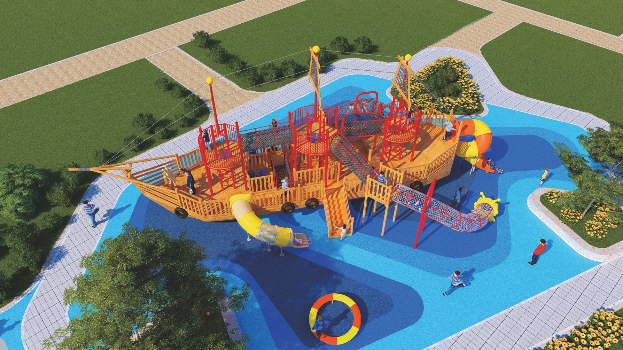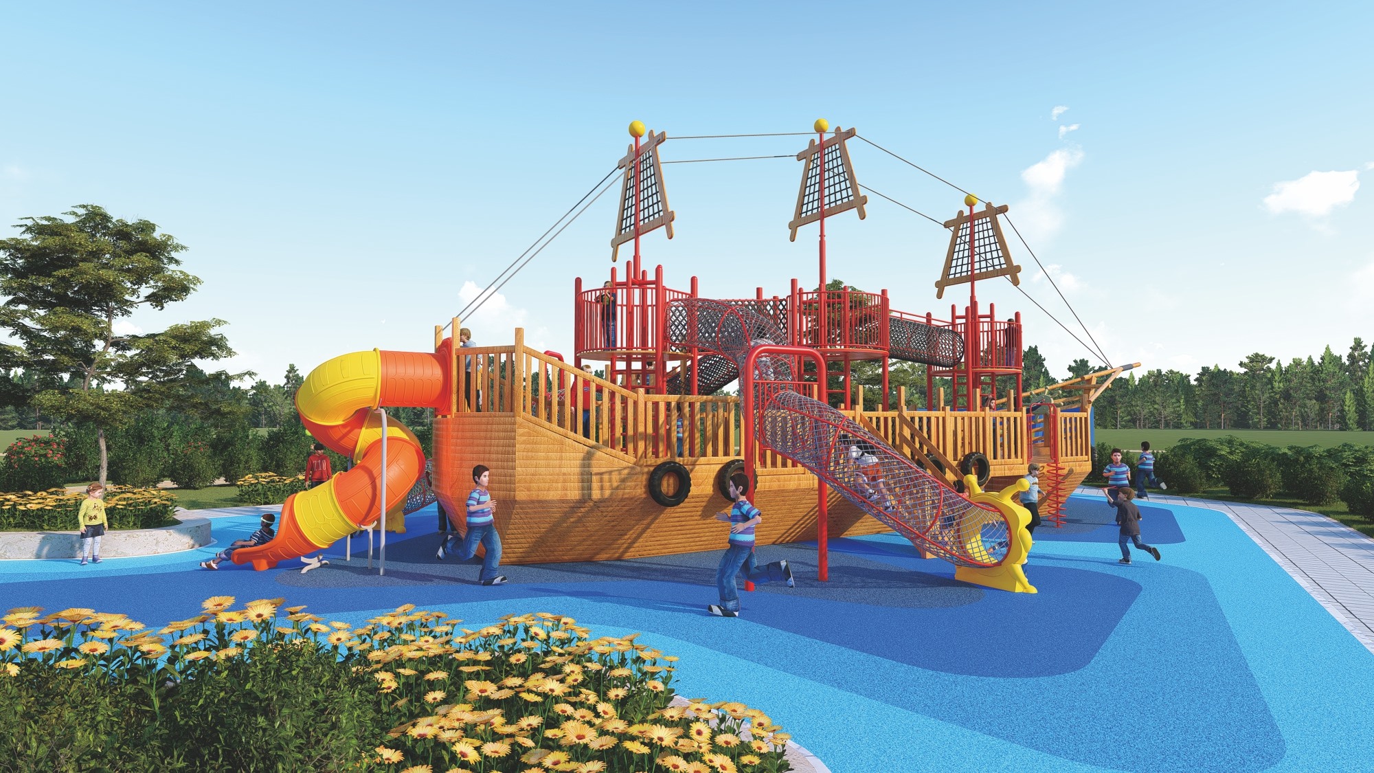 • 木质海盗船组合滑梯的设计以大自然为主题,融合了船体、桅杆、甲板等元素,外观新颖、结构牢固。它集攀爬、滑梯、秋千等功能于一体,旨在锻炼孩子的平衡协调能力和自我保护意识,同时培养探险精神。